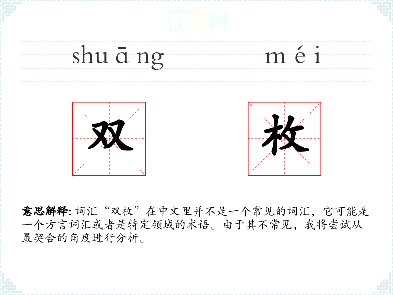 “双枚”字面意思可能是指“两枚”,其中“双”表示“两个”,“枚”是一个量词,通常用于小而扁平的物品,如邮票、硬币等。