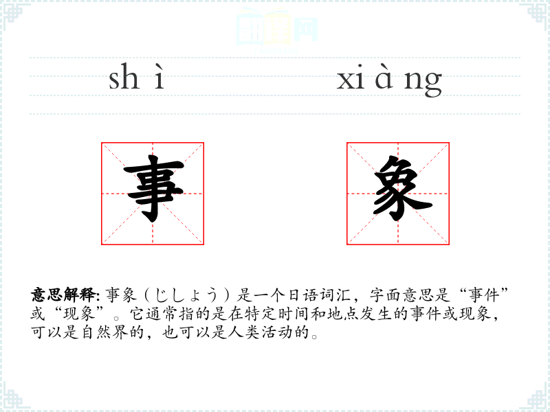 事象由“事”(じ)和“象”(しょう)组成,前者指**,后者指现象。这个词在日语中有着悠久的历史,但其现代用法主要是在近现代科学和文学中得到发展。