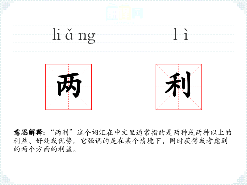 “两利”这个词汇的词源较为直接,由“两”和“利”两个字组成,没有特别复杂的历史演变。在中文中,“两”通常指两个,而“利”指利益或好处,因此“两利”自然指的是两种利益。