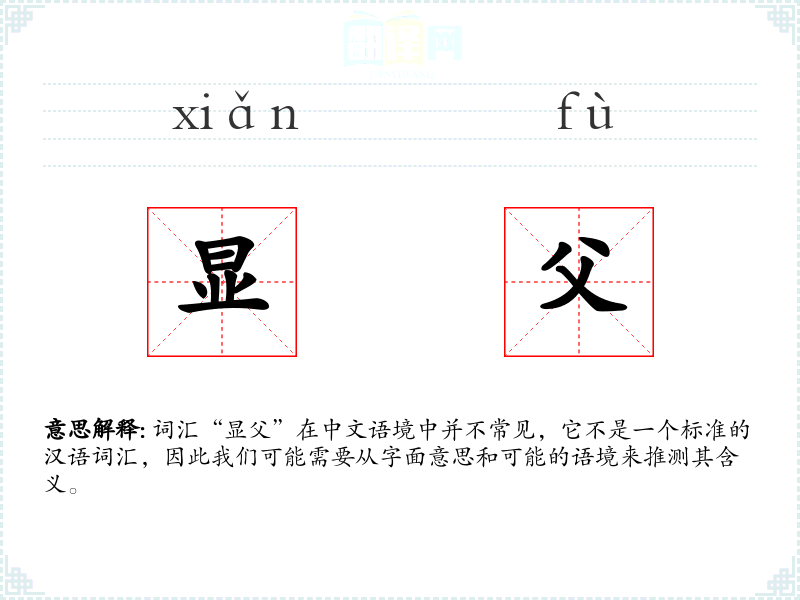 词汇“显父”在中文语境中并不常见,它不是一个标准的汉语词汇,因此我们可能需要从字面意思和可能的语境来推测其含义。