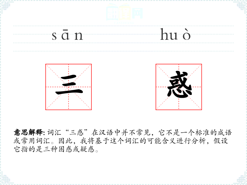 词汇“三惑”在汉语中并不常见,它不是一个标准的成语或常用词汇。因此,我将基于这个词汇的可能含义进行分析,假设它指的是三种困惑或疑惑。