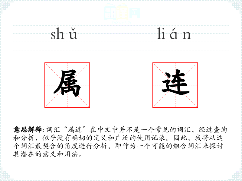 词汇“属连”在中文中并不是一个常见的词汇,经过查询和分析,似乎没有确切的定义和广泛的使用记录。因此,我将从这个词汇最契合的角度进行分析,即作为一个可能的组合词汇来探讨其潜在的意义和用法。