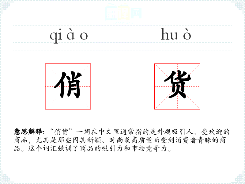 “俏货”一词在中文里通常指的是外观吸引人、受欢迎的商品,尤其是那些因其新颖、时尚或高质量而受到消费者青睐的商品。这个词汇强调了商品的吸引力和市场竞争力。