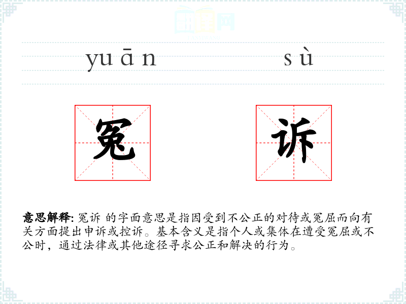 - 口语:在日常口语中,冤诉可能被简化为“诉苦”或“喊冤”,表达个人对不公待遇的不满和寻求帮助的愿望。