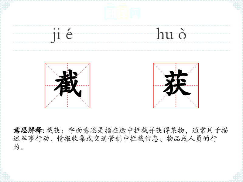 - 专业领域:在军事、情报、网络安全等领域,截获是一个常用术语,指通过技术手段拦截通信或数据。