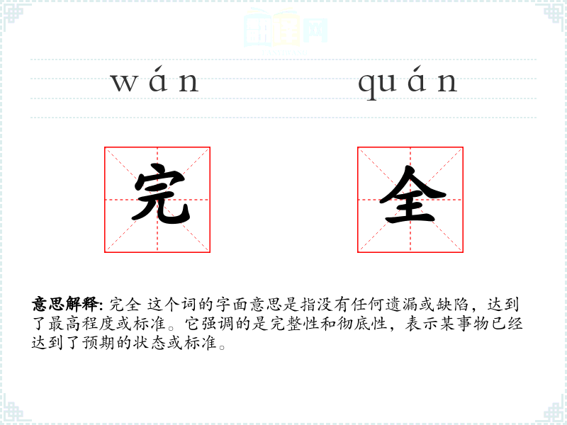 完全 这个词的字面意思是指没有任何遗漏或缺陷,达到了最高程度或标准。它强调的是完整性和彻底性,表示某事物已经达到了预期的状态或标准。