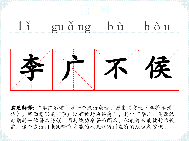 “李广不侯”是一个汉语成语,源自《史记·李将军列传》。字面意思是“李广没有被封为侯爵”,其中“李广”是西汉时期的一位著名将领,因其战功卓著而闻名,但最终未能被封为侯爵。这个成语用来比喻有才能的人未能得到应有的地位或赏识。