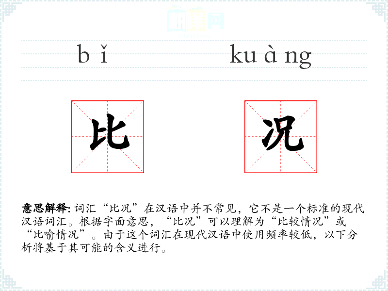 词汇“比况”在汉语中并不常见,它不是一个标准的现代汉语词汇。根据字面意思,“比况”可以理解为“比较情况”或“比喻情况”。由于这个词汇在现代汉语中使用频率较低,以下分析将基于其可能的含义进行。