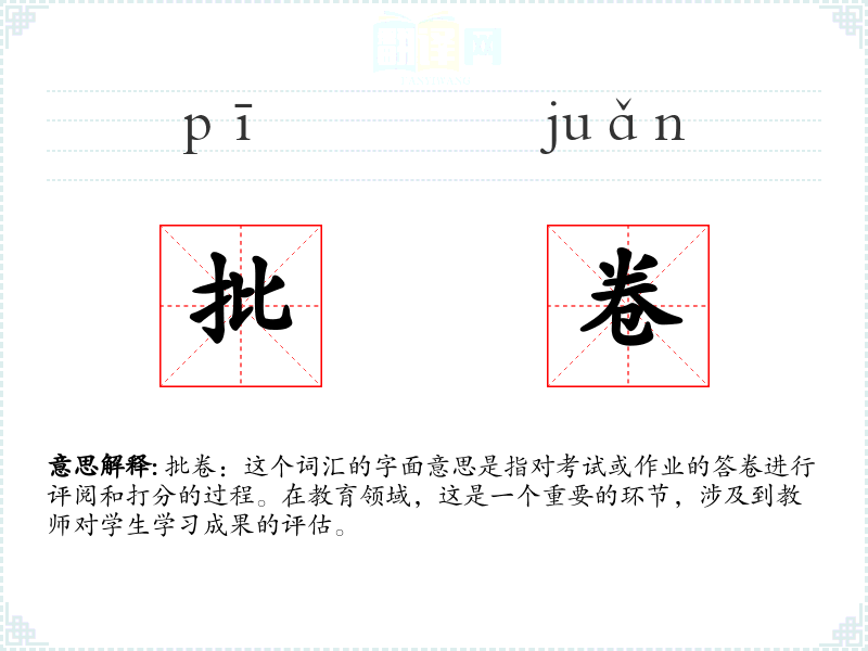 批卷:这个词汇的字面意思是指对考试或作业的答卷进行评阅和打分的过程。在教育领域,这是一个重要的环节,涉及到教师对学生学习成果的评估。