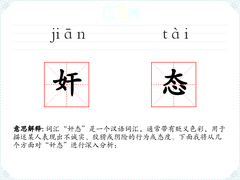 词汇“奸态”是一个汉语词汇,通常带有贬义色彩,用于描述某人表现出不诚实、狡猾或阴险的行为或态度。下面我将从几个方面对“奸态”进行深入分析: