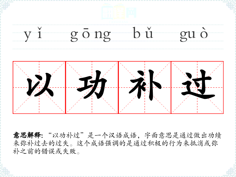 “以功补过”是一个汉语成语,字面意思是通过做出功绩来弥补过去的过失。这个成语强调的是通过积极的行为来抵消或弥补之前的错误或失败。