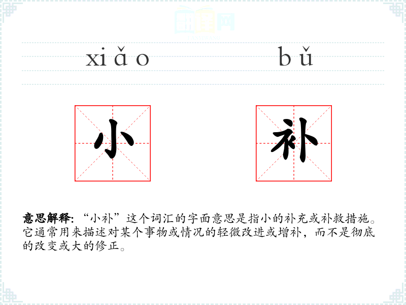 “小补”这个词汇的字面意思是指小的补充或补救措施。它通常用来描述对某个事物或情况的轻微改进或增补,而不是彻底的改变或大的修正。