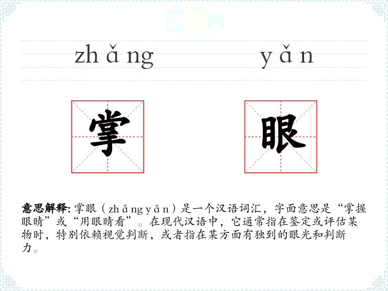 “掌眼”一词的词源较为直接,由“掌”(掌握)和“眼”(眼睛)组成,形象地描述了通过眼睛进行判断和掌握的过程。在古代,这个词可能更多用于描述实际的视觉判断,而在现代,它更多地用于比喻,指代在某一领域的专业判断能力。