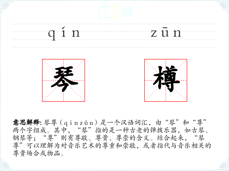 “琴”字最早见于甲骨文,代表一种古代的弦乐器。“尊”字则源于古代的酒器,后引申为尊敬、尊贵的意思。两者结合的“琴尊”可能在古代文献中较少见,更多是在近现代文学和艺术评论中出现,用以表达对音乐艺术的尊重。