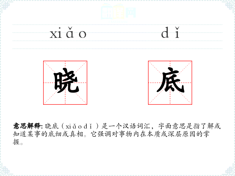 晓底(xiǎo dǐ)是一个汉语词汇,字面意思是指了解或知道某事的底细或真相。它强调对事物内在本质或深层原因的掌握。