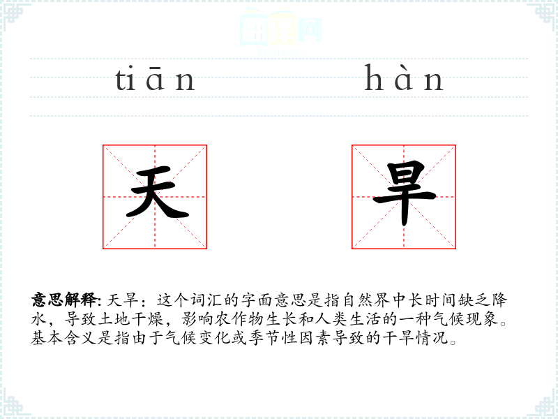 天旱:这个词汇的字面意思是指自然界中长时间缺乏降水,导致土地干燥,影响农作物生长和人类生活的一种气候现象。基本含义是指由于气候变化或季节性因素导致的干旱情况。