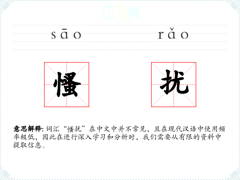 词汇“慅扰”在中文中并不常见,且在现代汉语中使用频率极低,因此在进行深入学习和分析时,我们需要从有限的资料中提取信息。