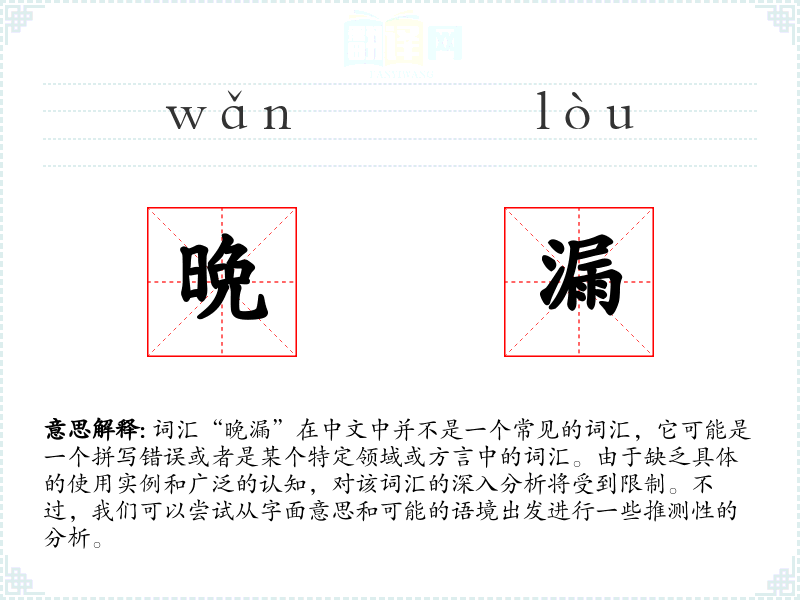 词汇“晚漏”在中文中并不是一个常见的词汇,它可能是一个拼写错误或者是某个特定领域或方言中的词汇。由于缺乏具体的使用实例和广泛的认知,对该词汇的深入分析将受到限制。不过,我们可以尝试从字面意思和可能的语境出发进行一些推测性的分析。