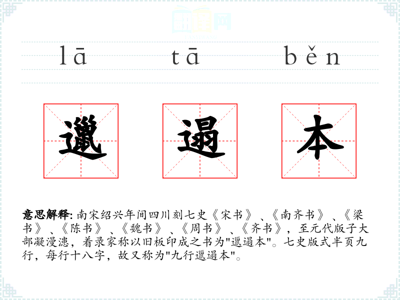 1.南宋绍兴年间四川刻七史《宋书》﹑《南齐书》﹑《梁书》﹑《陈书》﹑《魏书》﹑《周书》﹑《齐书》,至元代版子大部凝漫漶,着录家称以旧板印成之书为"邋遢本"。七史版式半页九行,每行十八字,故又称为"九行邋遢本"。