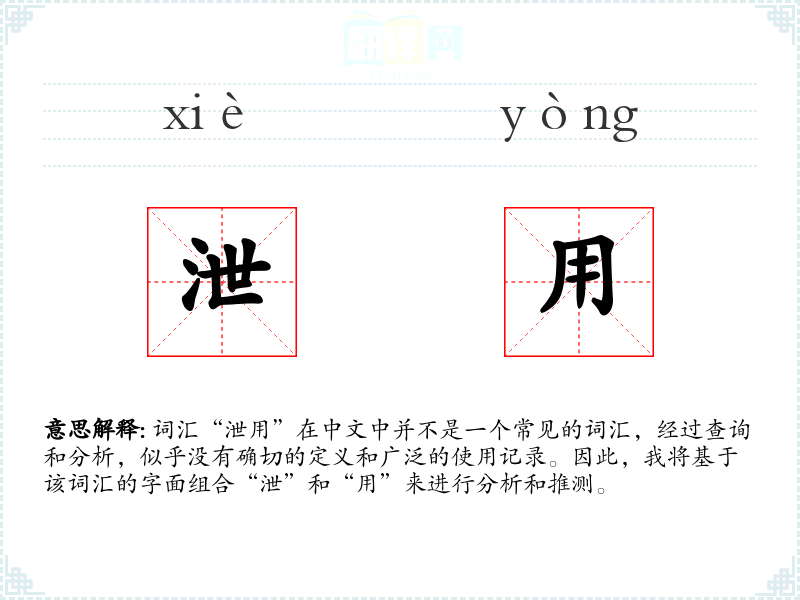 词汇“泄用”在中文中并不是一个常见的词汇,经过查询和分析,似乎没有确切的定义和广泛的使用记录。因此,我将基于该词汇的字面组合“泄”和“用”来进行分析和推测。