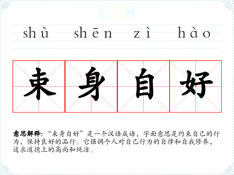 “束身自好”是一个汉语成语,字面意思是约束自己的行为,保持良好的品行。它强调个人对自己行为的自律和自我修养,追求道德上的高尚和纯洁。
