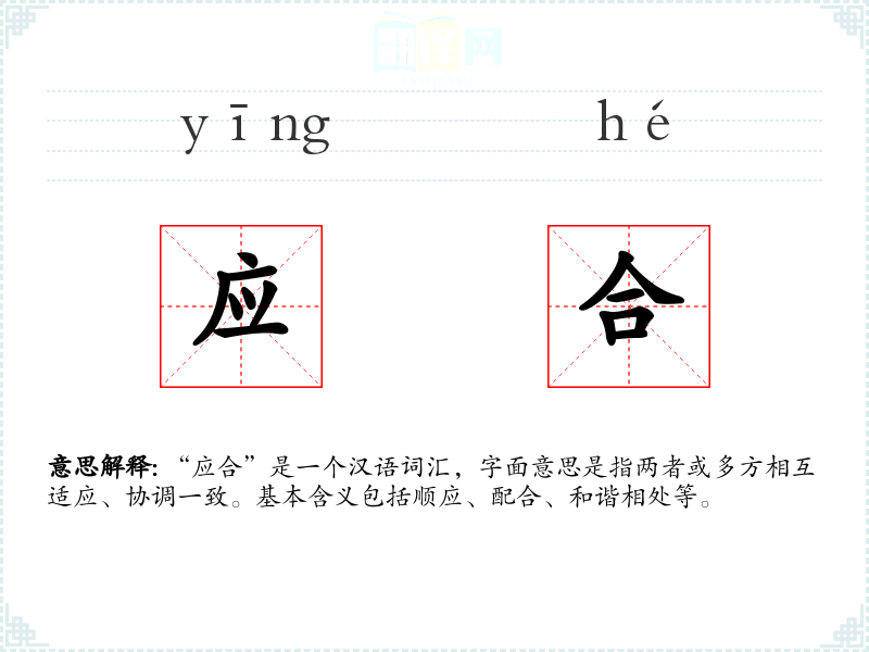 “应合”是一个汉语词汇,字面意思是指两者或多方相互适应、协调一致。基本含义包括顺应、配合、和谐相处等。