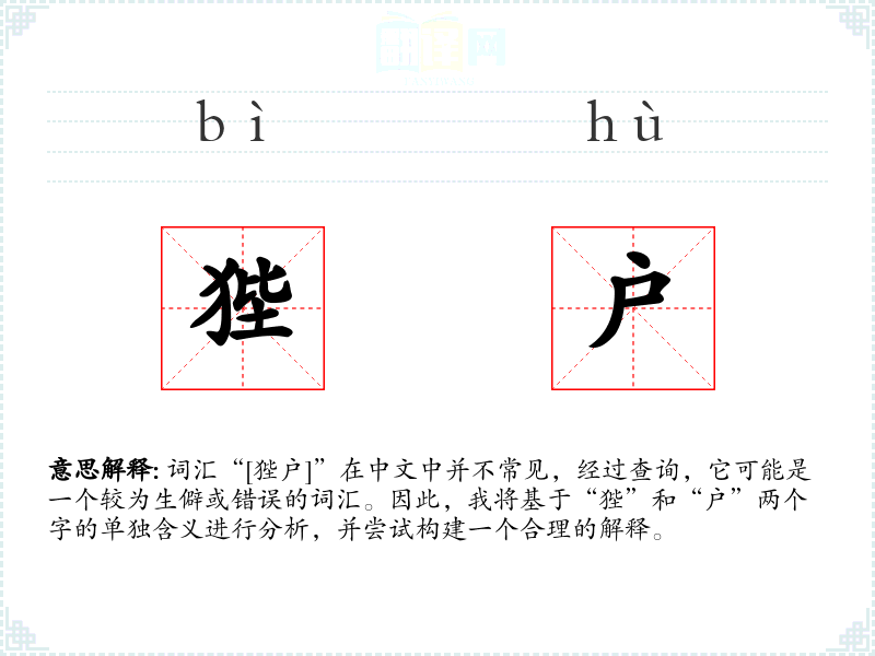 词汇“[狴户]”在中文中并不常见,经过查询,它可能是一个较为生僻或错误的词汇。因此,我将基于“狴”和“户”两个字的单独含义进行分析,并尝试构建一个合理的解释。