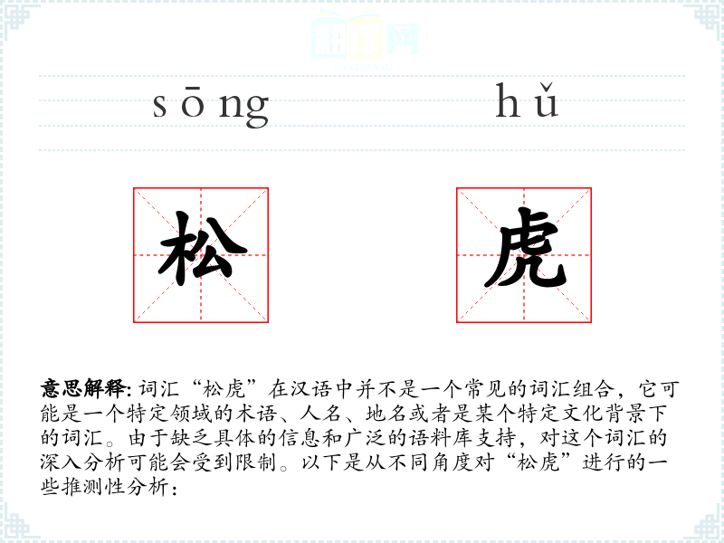 - 由于“松虎”不是一个常见词汇,对其的理解可能需要更多的上下文信息。在语言学*和表达中,了解特定词汇的文化背景和语境是非常重要的。