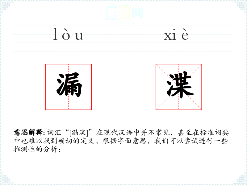词汇“[漏渫]”在现代汉语中并不常见,甚至在标准词典中也难以找到确切的定义。根据字面意思,我们可以尝试进行一些推测性的分析: