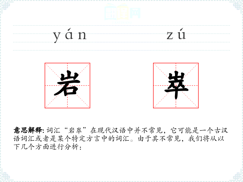 词汇“岩崒”在现代汉语中并不常见,它可能是一个古汉语词汇或者是某个特定方言中的词汇。由于其不常见,我们将从以下几个方面进行分析: