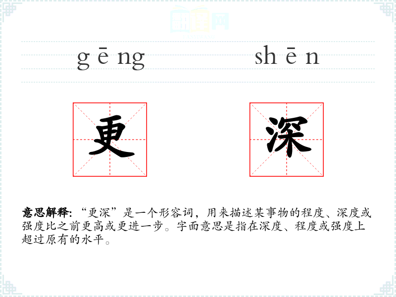 “更深”由“更”和“深”两个字组成。“更”在古代汉语中有“更加”、“再”的意思,而“深”则表示深度或深奥。随着语言的发展,这两个字结合形成了表示程度加深的意思。