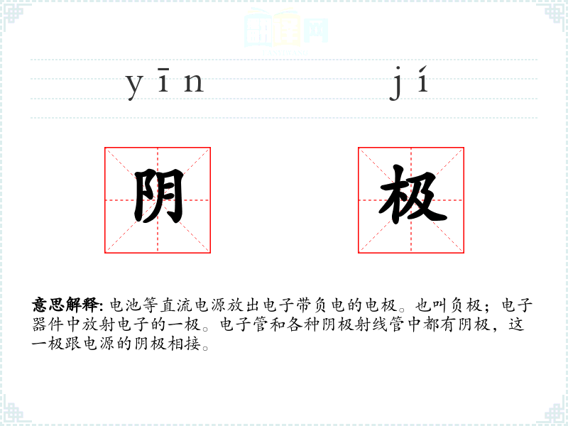 电池等直流电源放出电子带负电的电极。也叫负极;电子器件中放射电子的一极。电子管和各种阴极射线管中都有阴极,这一极跟电源的阴极相接。