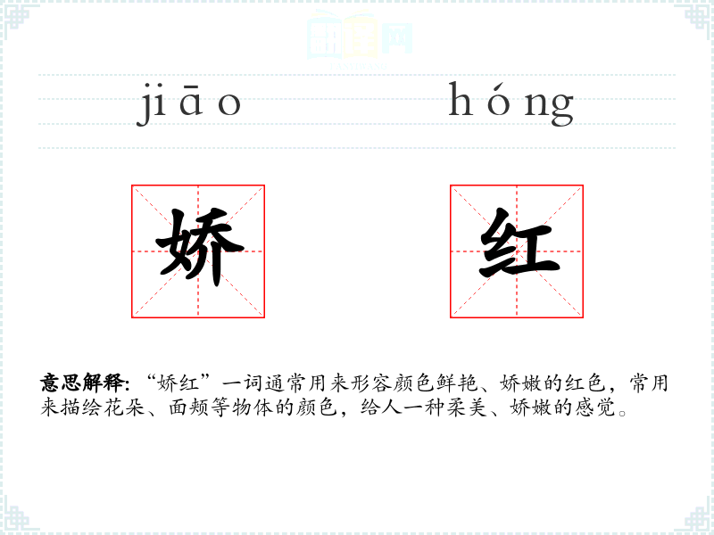 “娇红”一词通常用来形容颜色鲜艳、娇嫩的红色,常用来描绘花朵、面颊等物体的颜色,给人一种柔美、娇嫩的感觉。