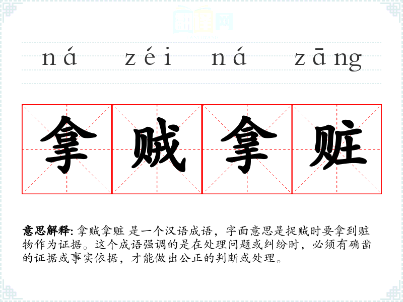 拿贼拿赃 是一个汉语成语,字面意思是捉贼时要拿到赃物作为证据。这个成语强调的是在处理问题或纠纷时,必须有确凿的证据或事实依据,才能做出公正的判断或处理。
