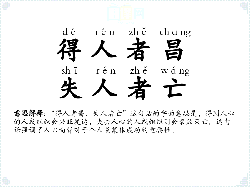 “得人者昌,失人者亡”这句话的字面意思是,得到人心的人或组织会兴旺发达,失去人心的人或组织则会衰败灭亡。这句话强调了人心向背对于个人或集体成功的重要性。