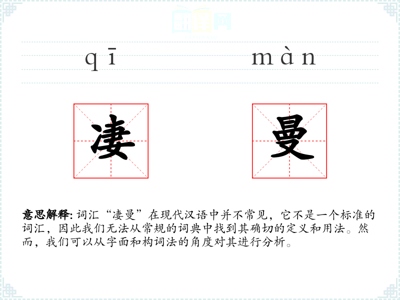词汇“凄曼”在现代汉语中并不常见,它不是一个标准的词汇,因此我们无法从常规的词典中找到其确切的定义和用法。然而,我们可以从字面和构词法的角度对其进行分析。