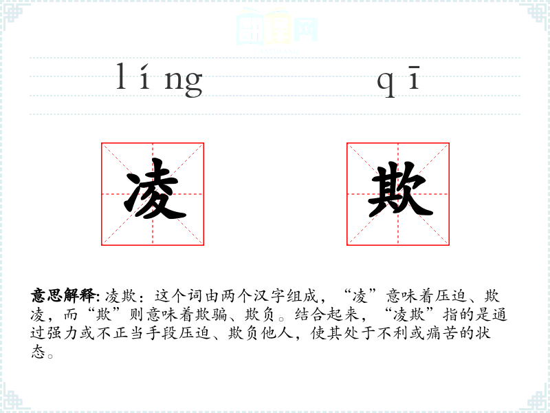 凌欺:这个词由两个汉字组成,“凌”意味着压迫、欺凌,而“欺”则意味着欺骗、欺负。结合起来,“凌欺”指的是通过强力或不正当手段压迫、欺负他人,使其处于不利或痛苦的状态。