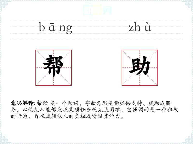 帮助 是一个动词,字面意思是指提供支持、援助或服务,以使某人能够完成某项任务或克服困难。它强调的是一种积极的行为,旨在减轻他人的负担或增强其能力。
