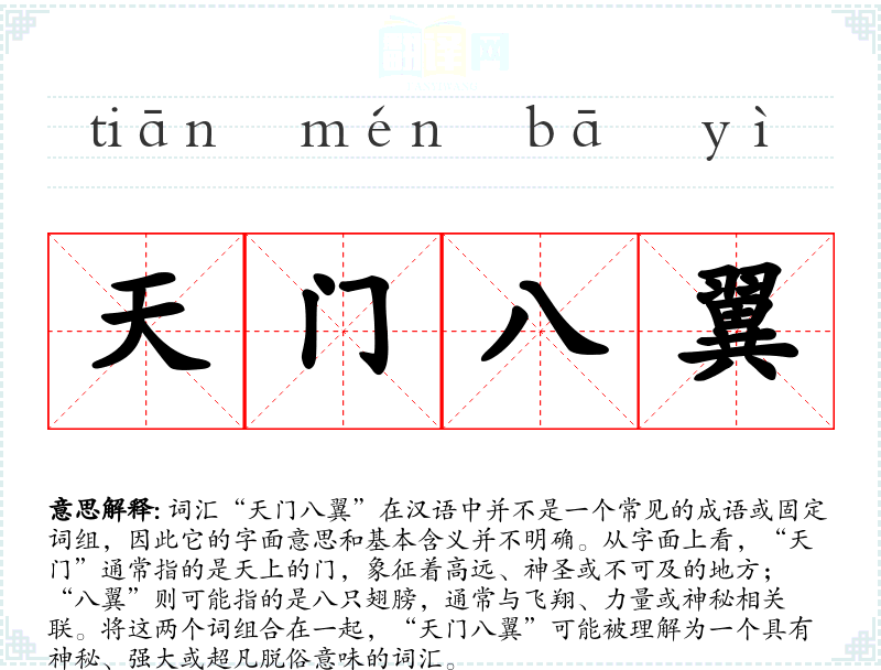 词汇“天门八翼”在汉语中并不是一个常见的成语或固定词组,因此它的字面意思和基本含义并不明确。从字面上看,“天门”通常指的是天上的门,象征着高远、神圣或不可及的地方;“八翼”则可能指的是八只翅膀,通常与飞翔、力量或神秘相关联。将这两个词组合在一起,“天门八翼”可能被理解为一个具有神秘、强大或超凡脱俗意味的词汇。