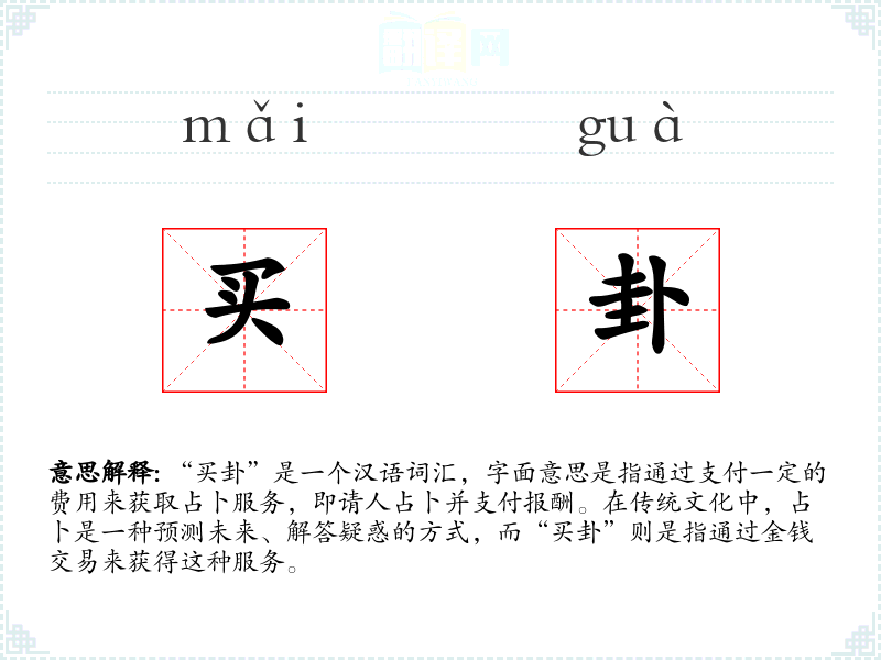- 文学语境:在古代文学作品中,“买卦”可能出现在描述人物寻求命运指引或解答疑难的情节中,如《红楼梦》中贾宝玉曾请人占卜。