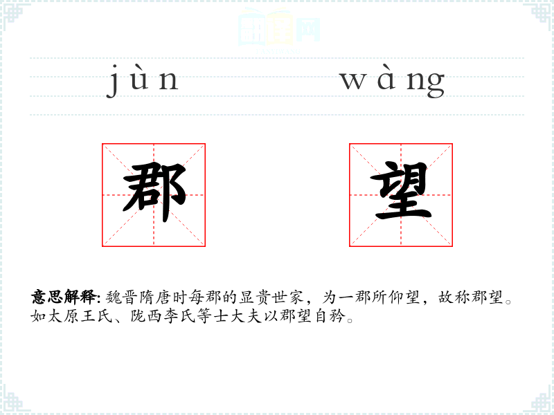 魏晋隋唐时每郡的显贵世家,为一郡所仰望,故称郡望。如太原王氏、陇西李氏等士大夫以郡望自矜。
