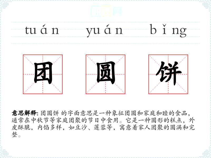 同义词:月饼、团圆糕、家庭饼 反义词:分离饼(假设性词汇,表示分离或不团圆的状态)