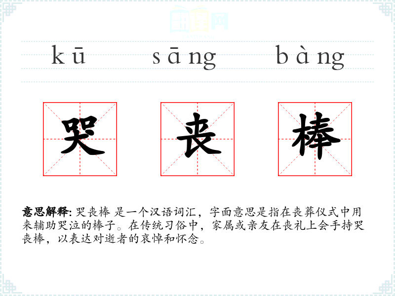 哭丧棒 是一个汉语词汇,字面意思是指在丧葬仪式中用来辅助哭泣的棒子。在传统*俗中,家属或亲友在丧礼上会手持哭丧棒,以表达对逝者的哀悼和怀念。