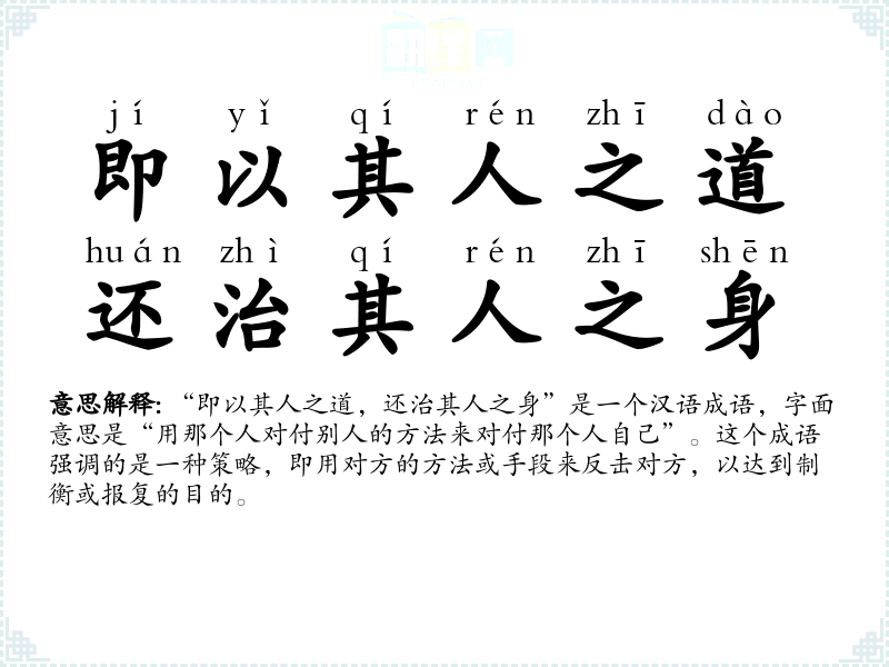 “即以其人之道,还治其人之身”这个成语在汉语中是一个非常有力的表达,它体现了智慧和策略。在不同的语境中,它都可以用来描述一种反击或报复的行为。在语言学*和表达中,理解和正确使用这个成语是非常重要的。
