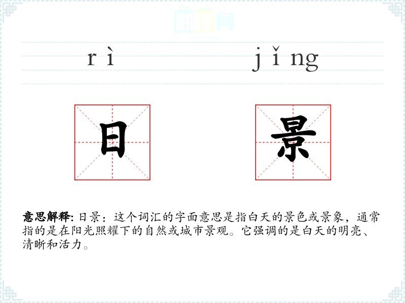 “日景”这个词汇在中文中的使用相对直接,由“日”(太阳、白天)和“景”(景色、景象)组成。它的使用历史悠久,但在现代汉语中仍然是一个常用词汇,没有发生太大的语义变化。