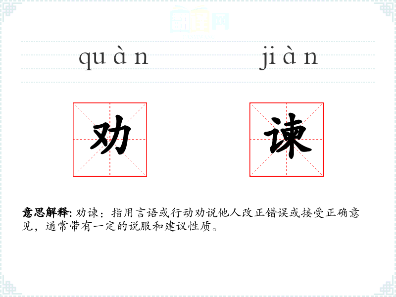 - 口语:在日常对话中,劝谏可以是朋友之间对不良行为的提醒,或是长辈对晚辈的忠告。