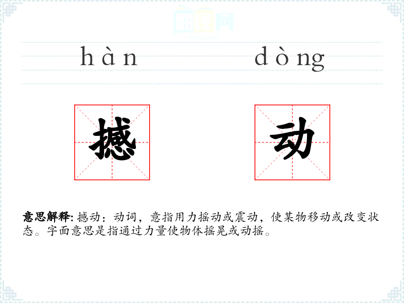 撼动:动词,意指用力摇动或震动,使某物移动或改变状态。字面意思是指通过力量使物体摇晃或动摇。