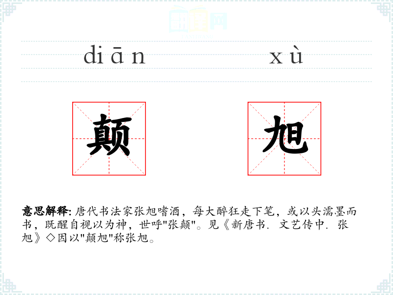 唐代书法家张旭嗜酒,每大醉狂走下笔,或以头濡墨而书,既醒自视以为神,世呼"张颠"。见《新唐书.文艺传中.张旭》◇因以"颠旭"称张旭。