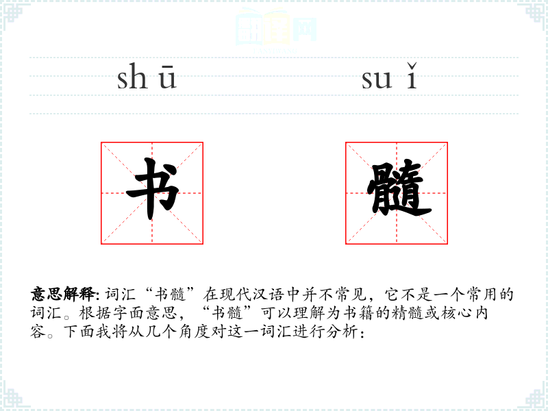 词汇“书髓”在现代汉语中并不常见,它不是一个常用的词汇。根据字面意思,“书髓”可以理解为书籍的精髓或核心内容。下面我将从几个角度对这一词汇进行分析: