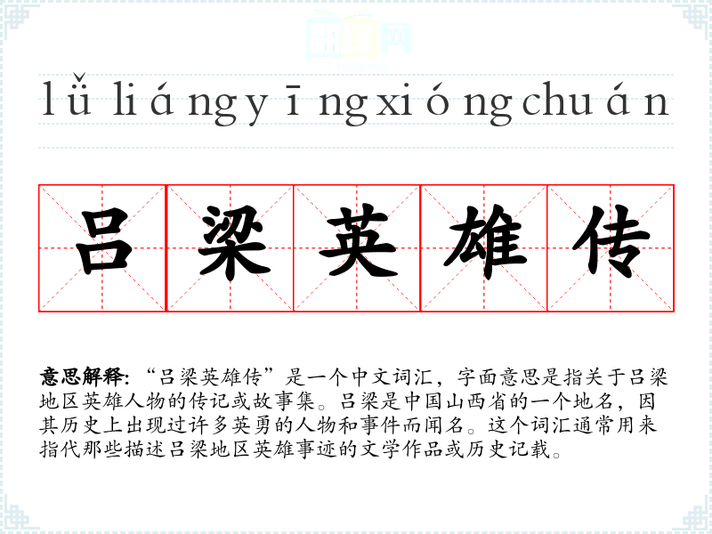 在文学语境中,“吕梁英雄传”可能指的是一部具体的小说、戏剧或诗歌集,专门讲述吕梁地区的英雄故事。在口语中,这个词汇可能被用来泛指任何关于英雄的故事,不一定局限于吕梁地区。在专业领域,如历史学或文学研究中,这个词汇可能被用来指代对吕梁地区英雄历史的研究或文献。